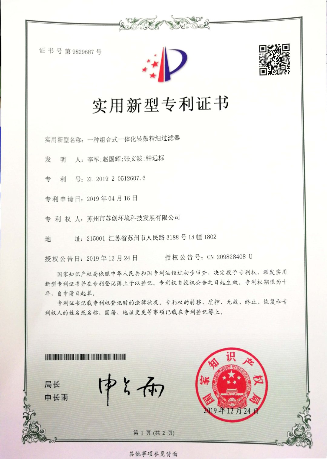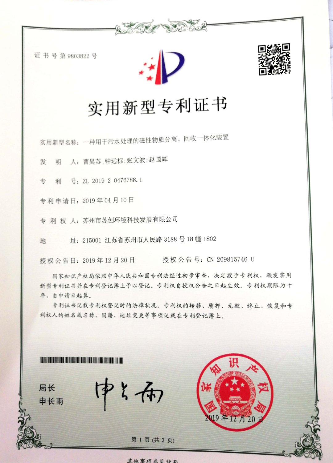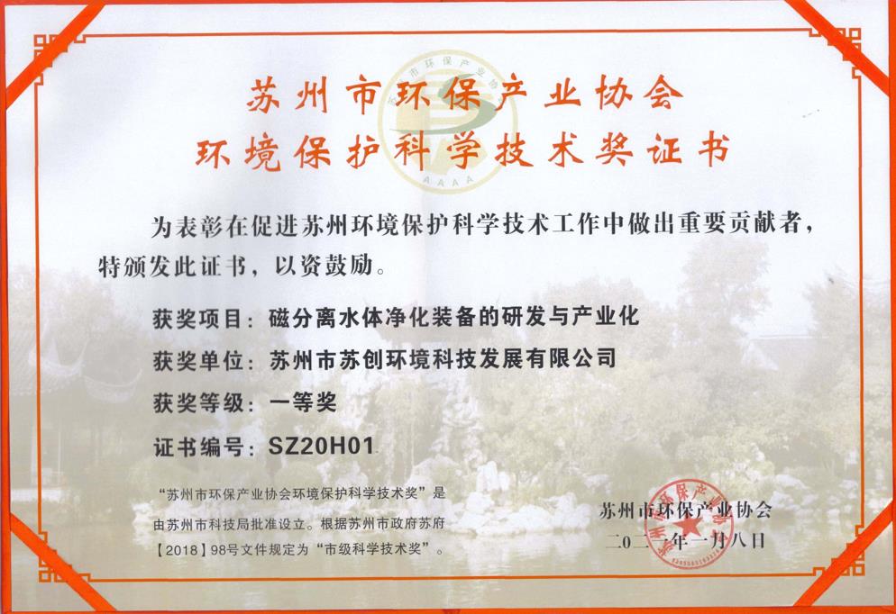 磁分離+反硝化+曝氣生物濾池一體化裝備 采用磁沉淀和曝氣生物濾池相結合的水體凈化工藝蘇創環境 · 專利與榮譽成果
